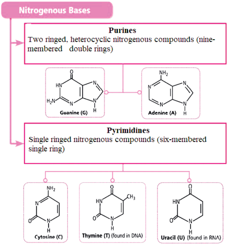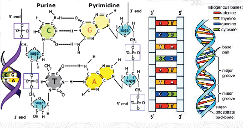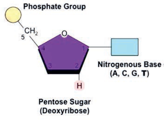 Each nucleotide is composed of a sugar, phosphate group and a nitrogenous base. There are four types of nitrogenous bases. These are: Adenine (A), Thymine (T), Guanine (G) and Cytosine (C). The nitrogen bases belong to the two large chemical families called purine and pyrimidine. The A and G are purines and the C and T are pyrimidine’s. A pairs with T and C pairs with G to form units called base pairs. Each base is also attached to a sugar molecule and a phosphate molecule to form a nucleotide, the building blocks of the DNA called nucleotide.