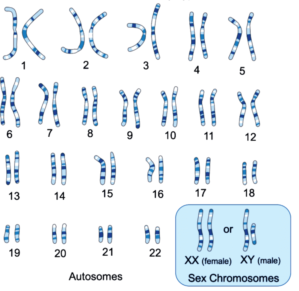 Chromosomes exist in pair in diploid organisms in which one chromosome is always inherited from the mother and the other from the father. For example a human cell contains 46 chromosomes which exist in 23 pairs of chromosomes. Human Karyotype, male and female looks like: