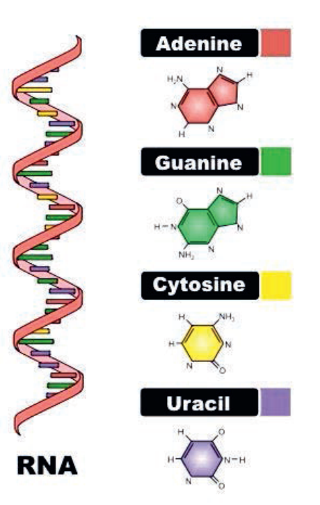 The structure of RNA RNA has single strand structure. RNA contains the sugar ribose, phosphates, and the nitrogenous bases adenine (A), guanine (G), cytosine (C) and uracil (U) which replaces thymine in DNA. There are three most well-known types of RNA in all organisms. These are messenger RNA (mRNA), transfer RNA (tRNA) and ribosomal RNA (rRNA). All types of RNAs are formed on DNA strands by transcription process. In the next section, we shall see the role of each type of RNA in protein synthesis.
