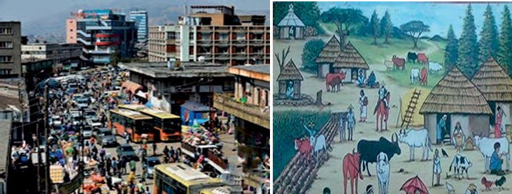 The pictures are about what life look likes in cities and villages.