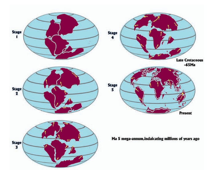 At about 160 Ma, Pangaea divided into two bigger landmasses called Gondwanaland and Laurasia. The Indian sub-continent separated from the Gondwana collides with Eurasia and initiated the formation of the Himalayas ranges. The two giant continents (Gondwanaland & Laurasia), then moved- a part east and west thereby resulting in the opening of the Atlantic Ocean.