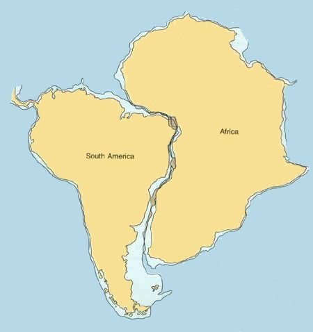 Jigsaw fit of continents: The coastlines of continents, especially South America and Africa, fit together like puzzle pieces.