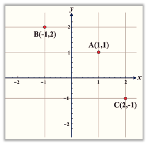 Plot the points whose coordinates are given on a Cartesian coordinate system. A (1, 1), B(-1, 2), C(2, -1).
