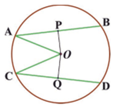 Given: Chords (AB) and (CD) are equal in length. Construction: Join points 𝐴 and 𝐶 with center 𝑂 and drop perpendiculars from 𝑂 to the chords (AB) and (CD) (see figure). We want to prove: (OP) ≡ (OQ).