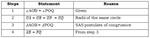 | 3 | ∆𝐴𝑂𝐵 ≡ ∆𝑃𝑂𝑄 | SSS postulate of Congruence |