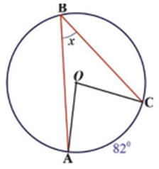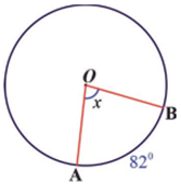 In figure below, m(∠𝐴𝑂𝐵) is a central angle with an intercepted minor arc 𝐴𝐵 whose measure is 82°, i.e., 𝑥 = 82°. Arc AB is minor arc. (Why?)
